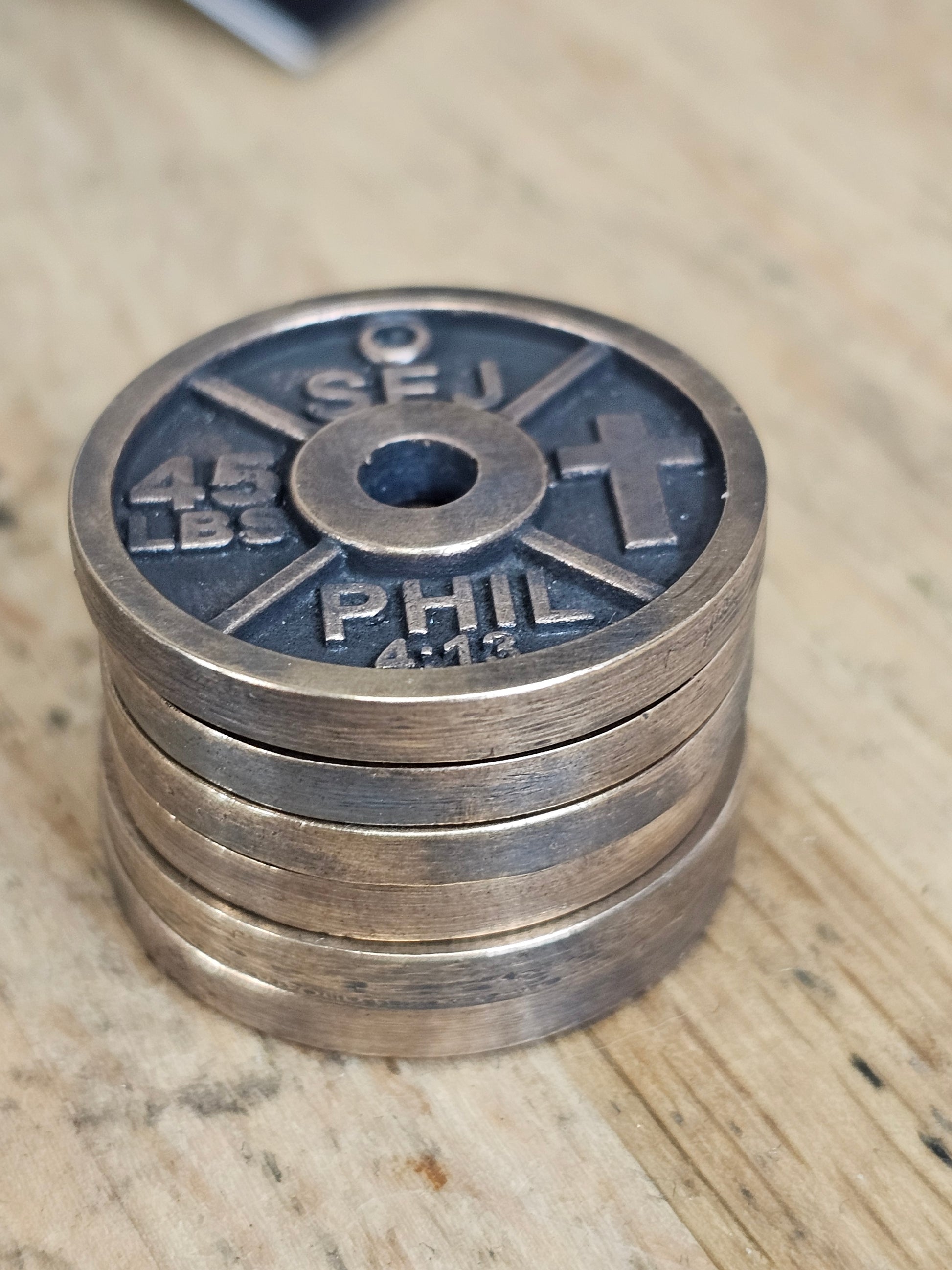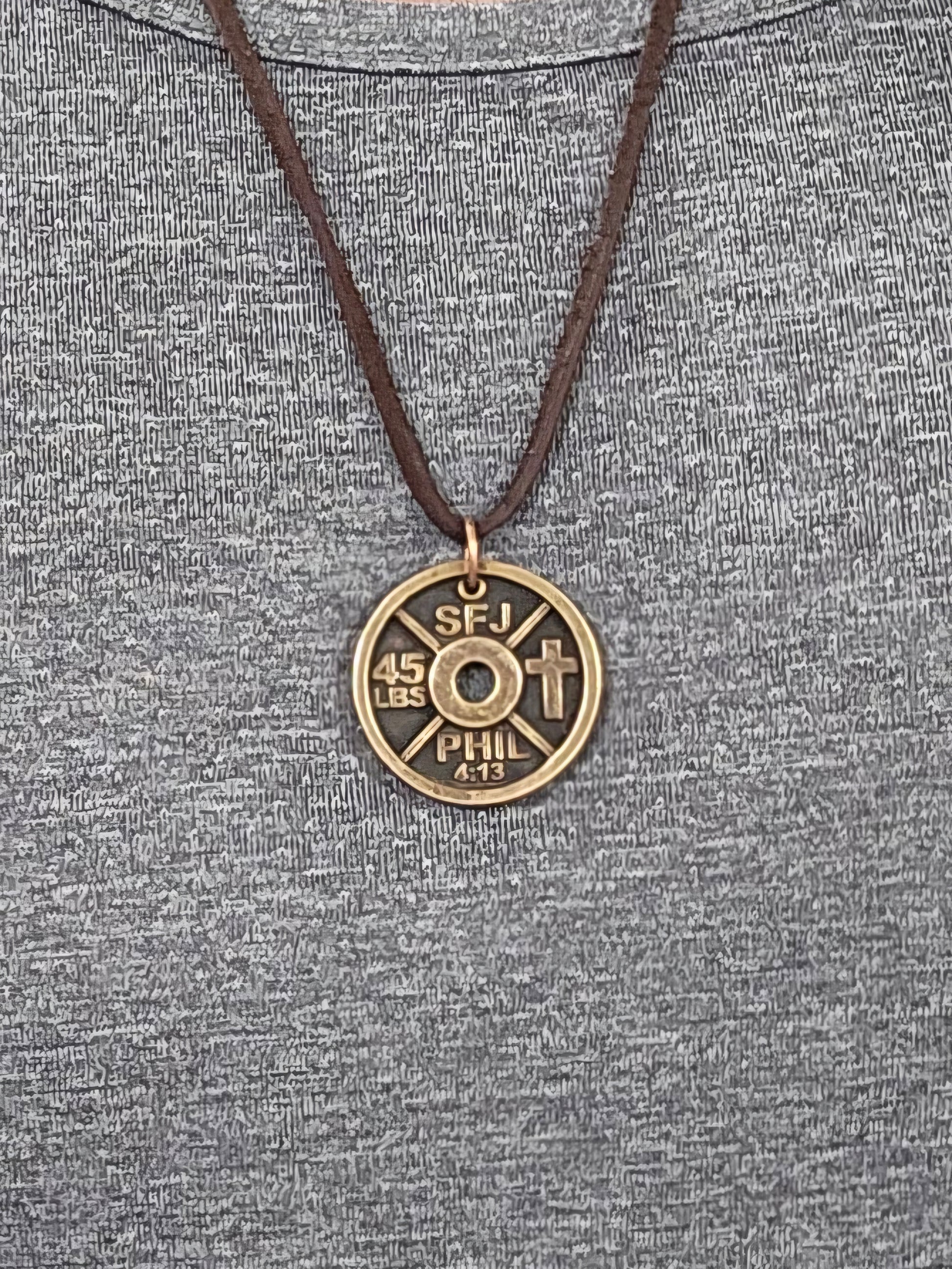 This 27mm bronze pendant is individually crafted using the ancient lost-wax casting process—no shortcuts, no mass production. Each piece begins as a hand-designed model, printed in castable resin, burned out, and poured in molten bronze to create a medallion that looks and feels like a miniature 45-lb weight plate.